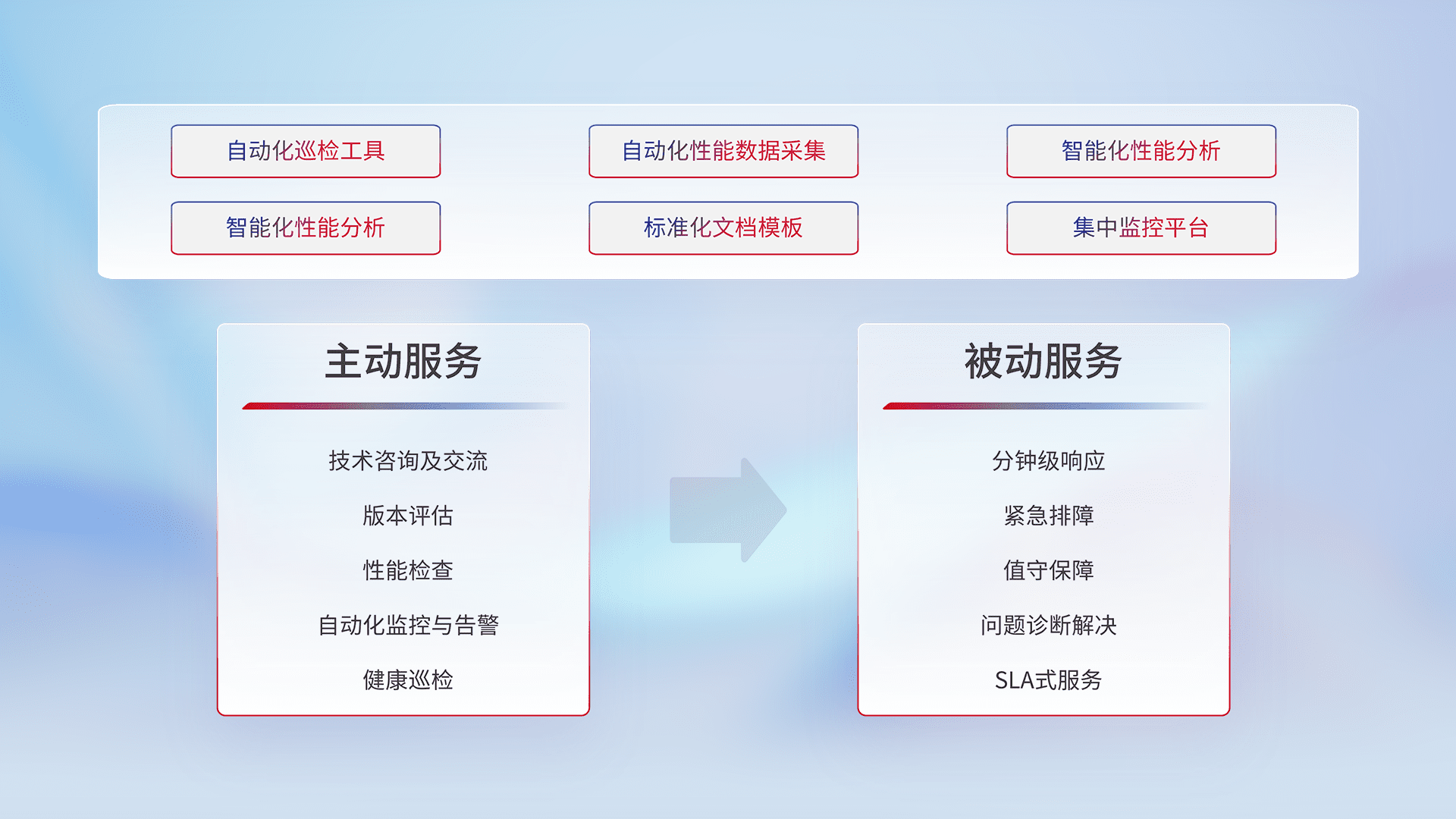 智能化工具和标准化文档,,,保障服务质量,,提供主动服务(包含技术咨询、、、版本评估、、、性能检查、、、自动化监控与告警、、、、健康巡检)和被动服务包含(分钟级响应、、、紧急排障、、、、值守保障、、、、问题诊断解决、、、SLA服务)。。